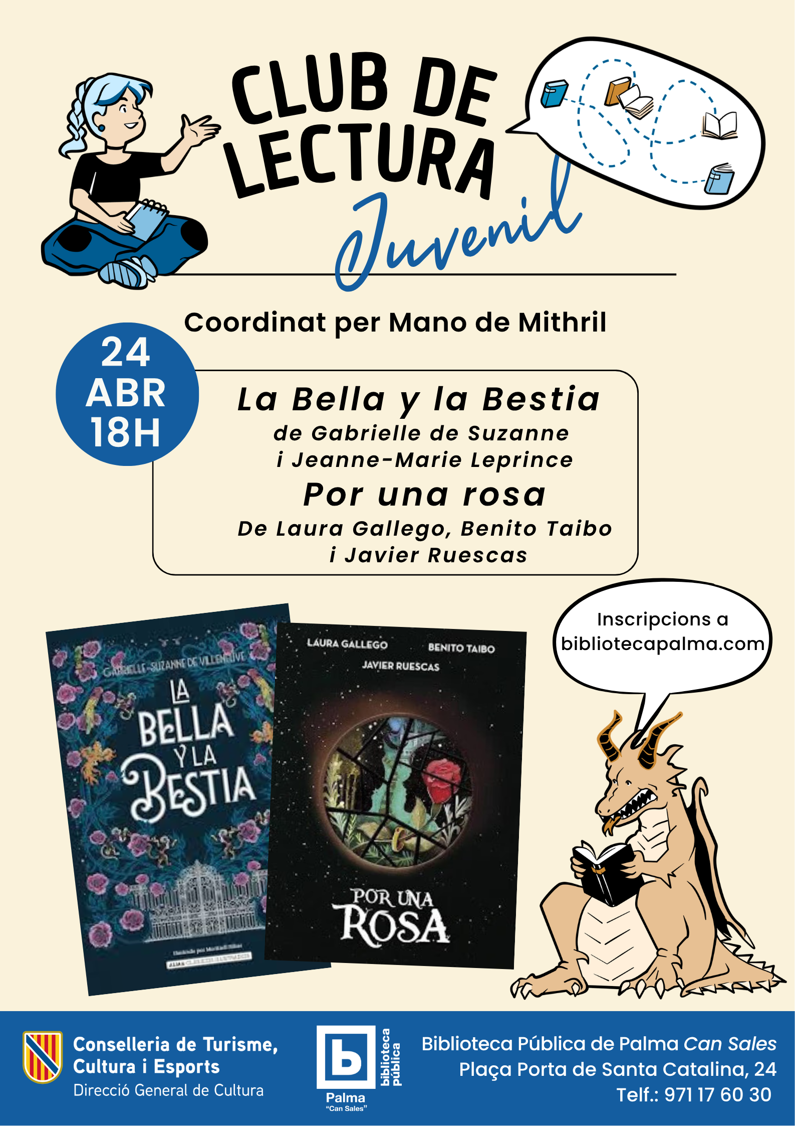 - 24/04 a las 18 h: La Bella y la Bestia de Gabrielle de Suzanne y Jeanne-Marie Leprince y Por una rosa de Laura Gallego, Benito Taibo y Javier Ruescas
