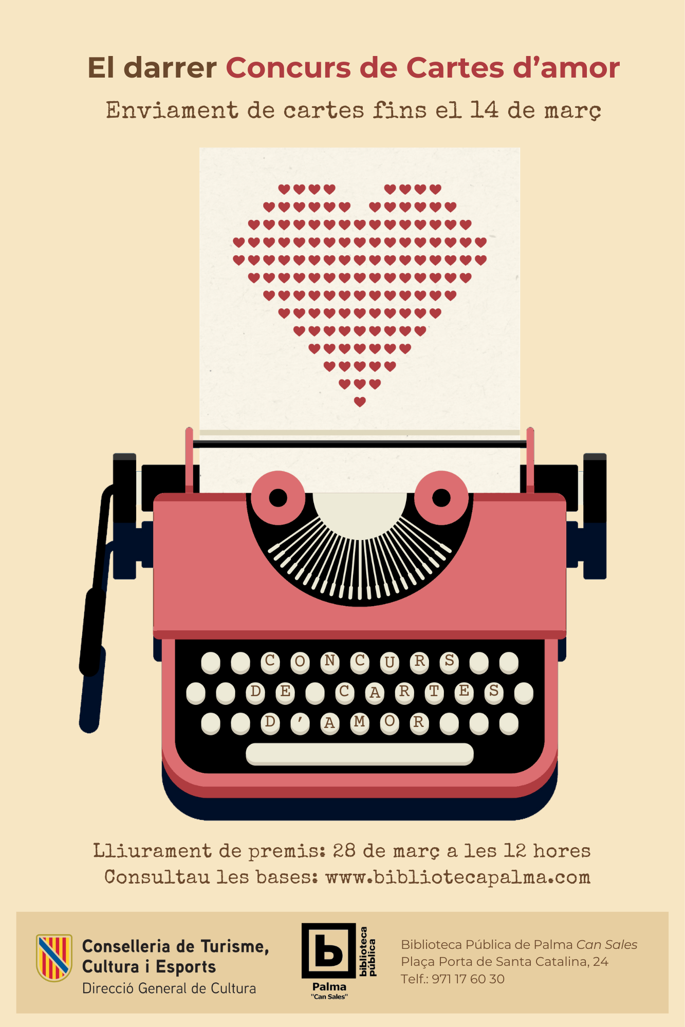 Podéis enviar vuestras cartas de amor a la dirección de correo electrónico de la biblioteca bpcansales@bibliotecapalma.com, desde el 14 de febrero hasta el 14 de marzo de 2026 estaremos abiertos a recibirlas.