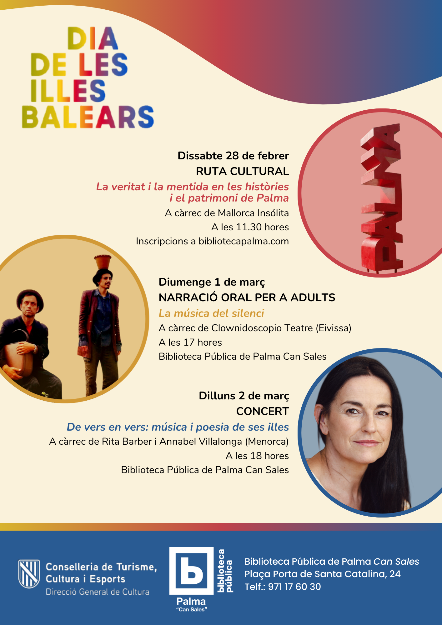 Concierto De vers en vers: música i poesia de ses illes, a cargo de Rita Barber y Annabel Villalonga (Menorca), el lunes 2 de marzo, a las 18 horas.