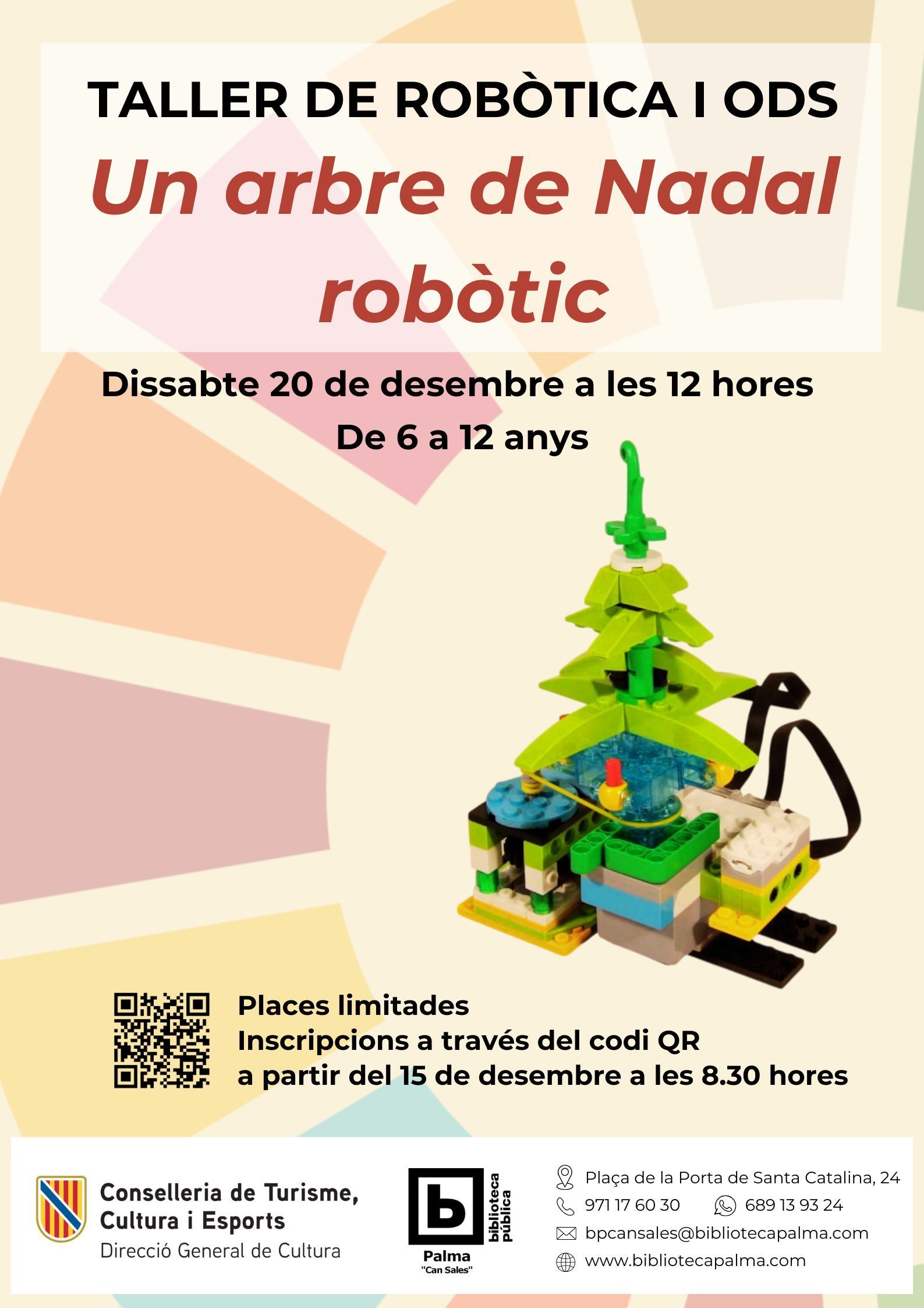 Taller de robótica y ODS Un arbre de Nadal robòtic a cargo de Robotix. De 6 a 12 años. Sábado 20 de diciembre a las 12 horas en la sala infantil. Plazas limitadas. Inscripciones a partir del 15 de diciembre aquí