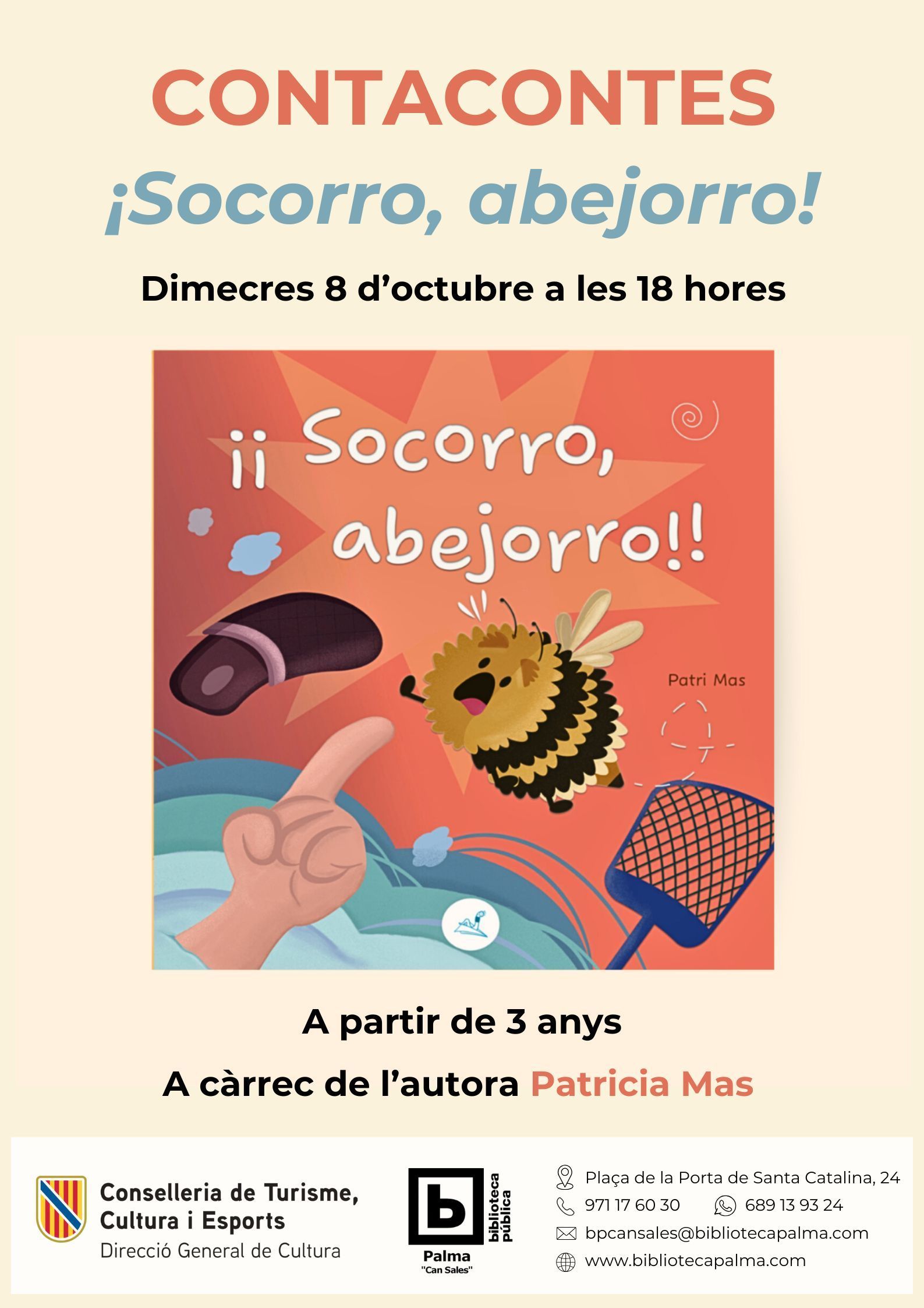 Contacontes i taller ¡Socorro, abejorro! a càrrec de l’autora Patricia Mas. A partir de 3 anys. Dimecres 8 d’octubre a les 18 hores a la sala infantil!