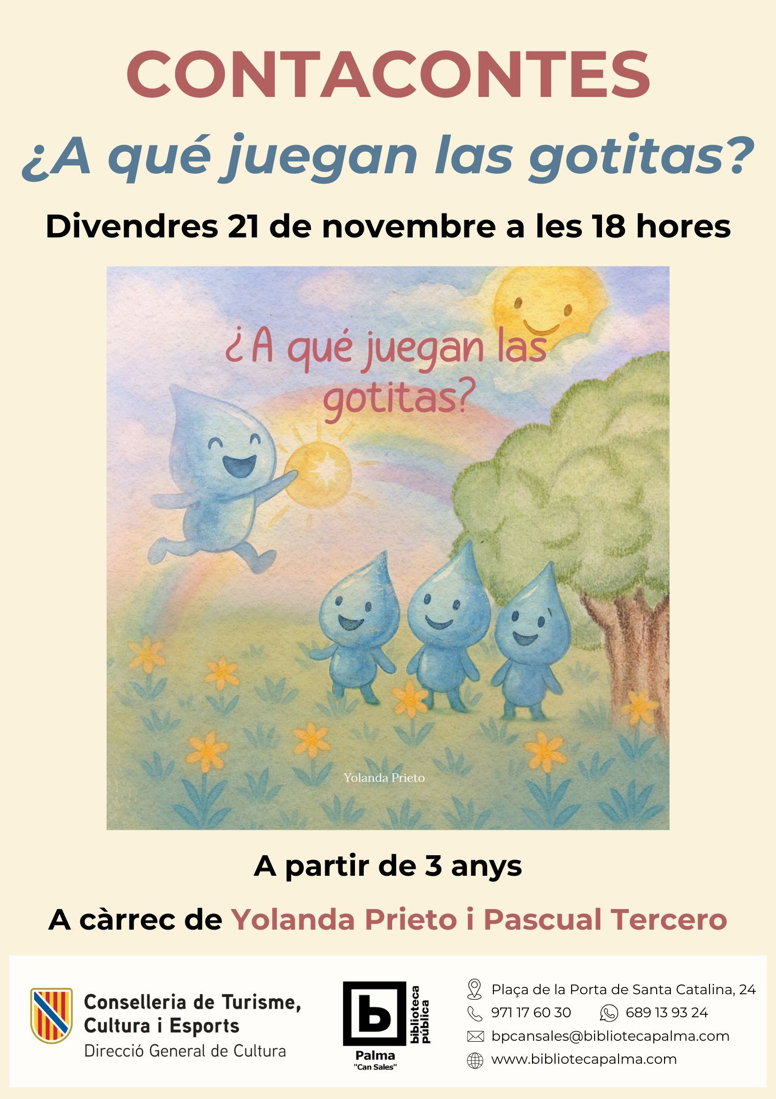 Presentació i contacontes ¿A qué juegan las gotitas? a càrrec del l’autora Yolanda Prieto Pons i l’il·lustrador Pascual Tercero Perelló. A partir de 3 anys. Divendres 21 de novembre a les 18 hores a la sala infantil!