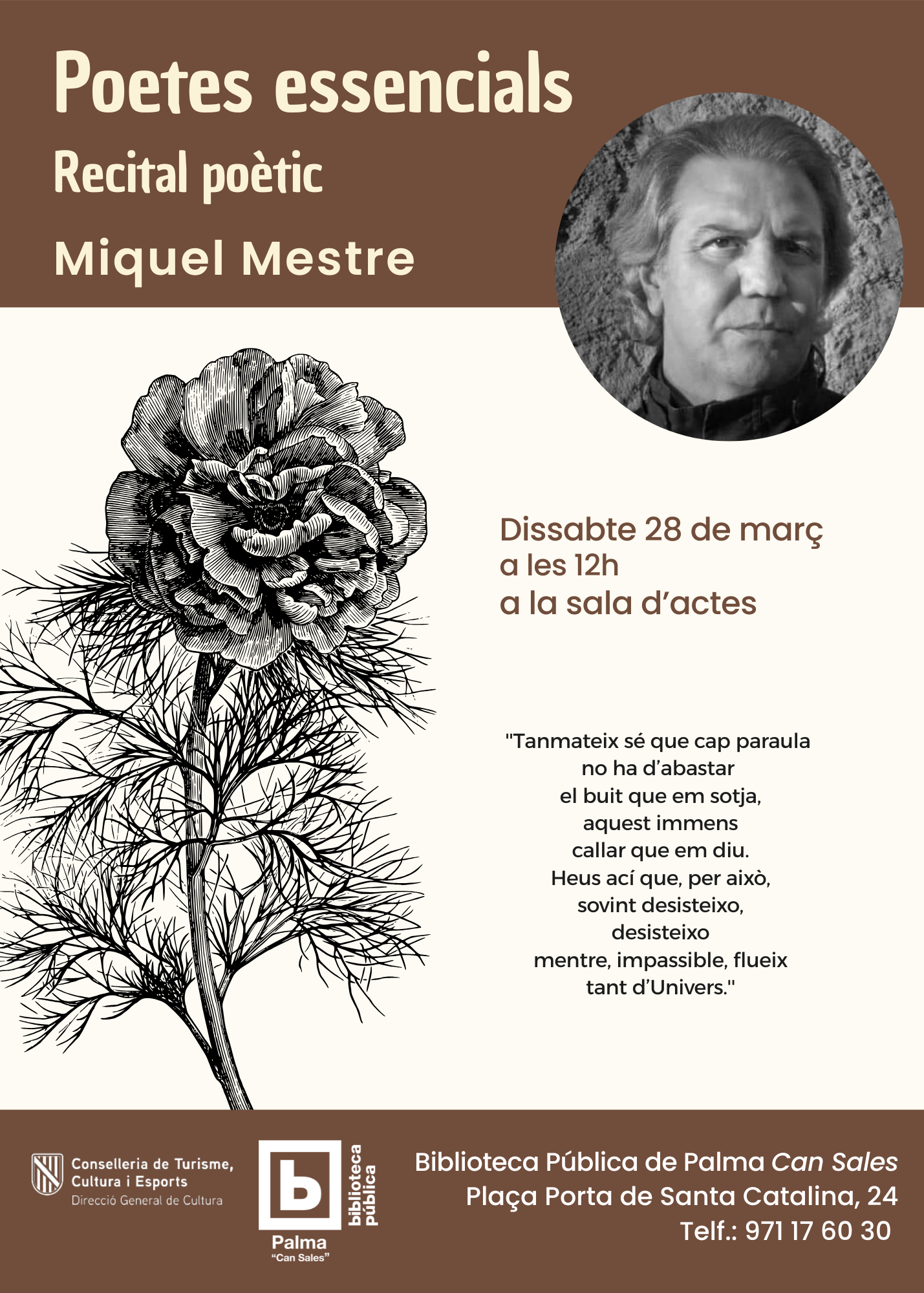 Recital poètic a càrrec de Miquel Mestre dissabte 28 de març a les 12h a la sala d'actes.